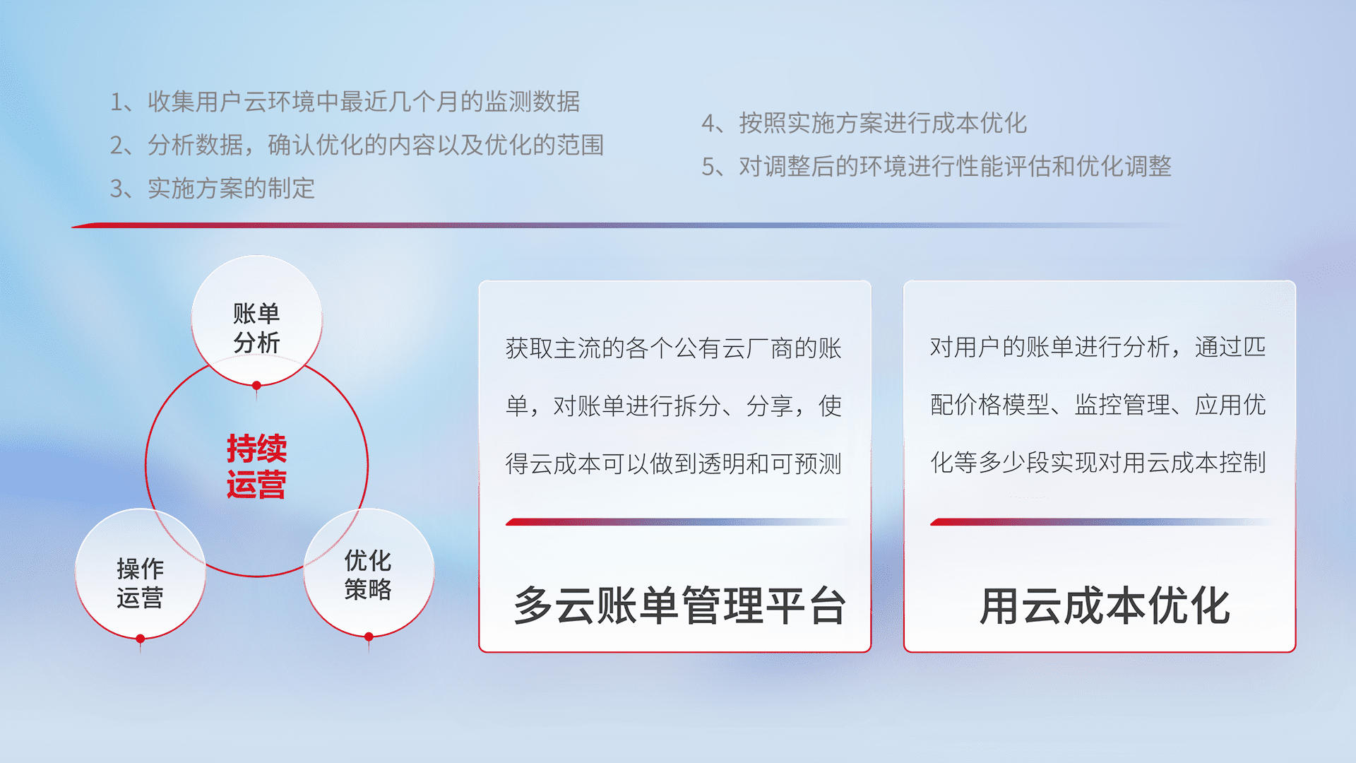 通过多云纳管,,,以统一的资源数据模型把客户的云资源进行抽象和封装,,,,进而实现对多云资源的统一操作,,保障云资源管理的可靠性、、、稳定性与可用性。。量身定制化运维内容,,,,配置、、、开发运维、、补丁管理、、、、备份、、、、监控、、、、认证和访问管理、、、审计和日常巡检等,,,保障在用云过程中的可靠度,,,稳定度以及高可用率。。