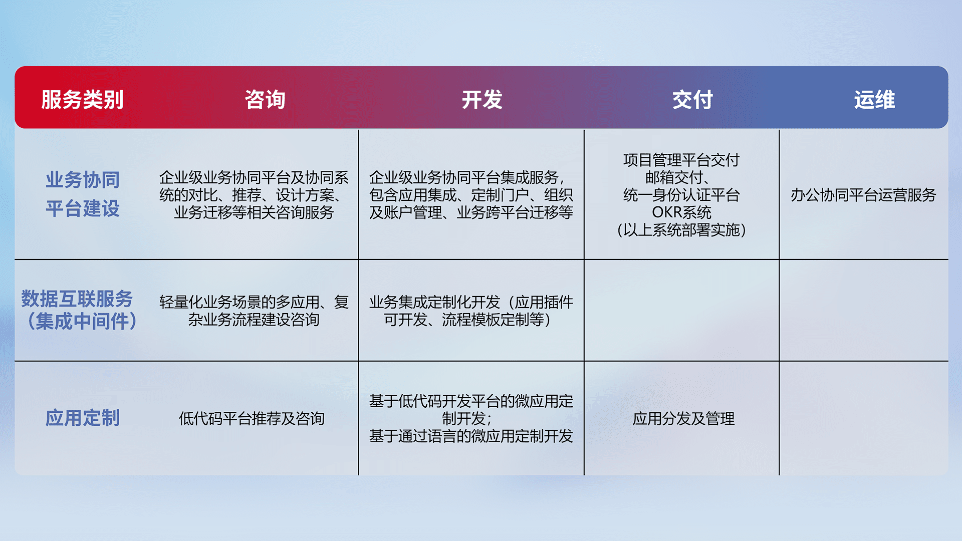 针对钉钉、、、企微、、IDaas等平台级产品提供产品的规划、、、、方案、、、交付、、、、定制化开发等服务,,,实现如统一协同办公、、、智能客户服务、、混合会议管理、、、智能数据查询、、、、等业务场景,,实现数字化转型。。